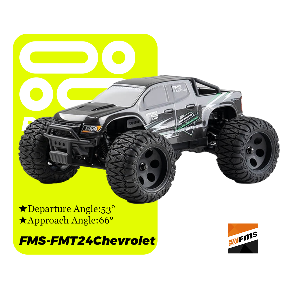Embark on off-road excitement with FMT24, the new series from FMS, authorized by General Motors. The 1/24 Chevrolet Colorado RC model impeccably mirrors the full-sized prototype's performance. With a robust nylon chassis, mid-mounted power unit, and a 2-speed gearbox, the Colorado offers seamless control and a sleek design. The powerful brushed motor, universal joint drive shaft, and large, shock-absorbing tires ensure an exhilarating off-road experience. The FMT24 Chevrolet Colorado is ready to hit the road, embracing the wild air of this brand-new off-road adventure.